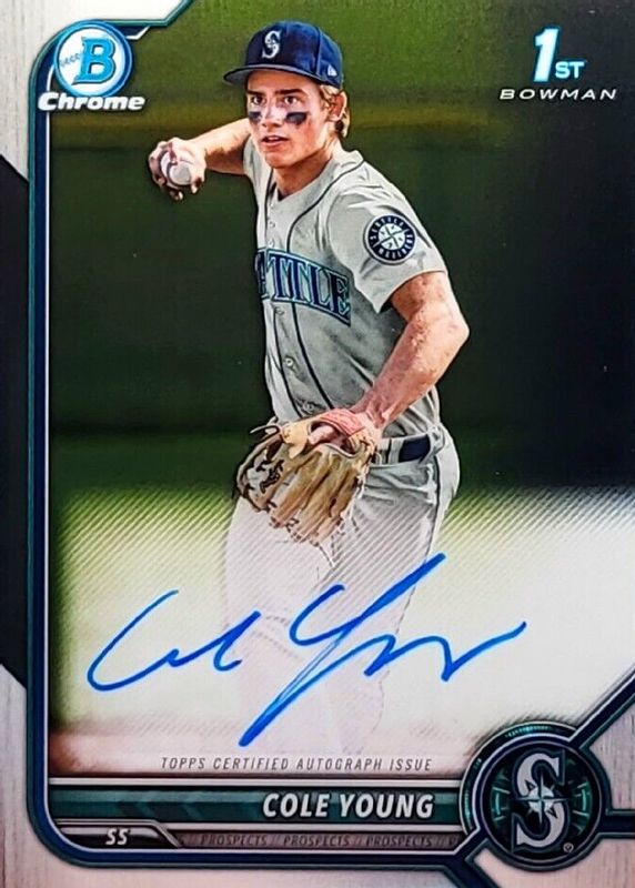 Young’s Bowman market is MUCH better than Merrill’s. First, the picture on the card is actually him (great start). Second, he has a 1st Bowman autograph. I like his value too. Shortstop’s a prime position. The Mariner’s play in relatively big market. And he flat-out has potential. His PSA 10 blue refractors (# /150) are going for around $550-$600. Seems steep, but that’s also a jersey-color match, which in the hobby comes at a premium. His ungraded gold refractor went for $560 in October. That’s where I think the value lies.