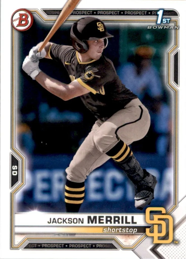 The picture at the top is, in fact, left-handed hitting Jackson Merrill. The picture on the bottom, of the Bowman card that Topps mass-produced and included in the 2021 Bowman Draft set, is of right-handed hitting, former teammate of his, Isaac Frye. Wow. Imagine you excel at every level of baseball, you finally get the chance to see your first pro baseball card, and it’s not you. With the decision to not include a 1st auto and their huge mistake on his base card, Topps essentially destroyed the market for Jackson Merrill. Because of this, I’m not adding his cards, but I do believe Merrill is ready to make a splash for a Padres team that may look to blow up its major league roster.