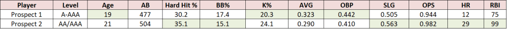Start with the AVG column, then just keep reading. Wow. Both prospects had tremendous seasons at the plate, especially across these categories. Among the top-150 ranked prospects going into the season, they finished 4th and 14th in OPS. Prospect 1 finished 9th in AVG, while Prospect 2 finished 4th in SLG and 5th in Hard-Hit %. Both finished top-25 in BB % (we won’t ignore the +20% K-rates, though). Who are they? Let’s start with the obvious: