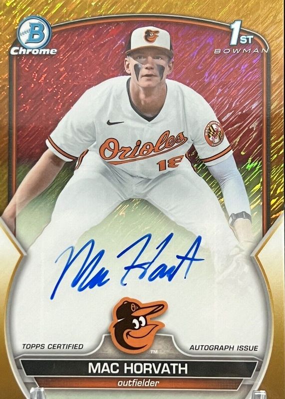 Being a 2023 draft selection you can find Mac Horvath’s Bowman 1sts in the 2023 Draft set. As much fun as it is to rip, hobby boxes are too expensive right now ($550) so I would direct you to the singles market. Where on average you can get a color (#’d) autograph for around $65-$75 to start your collection.