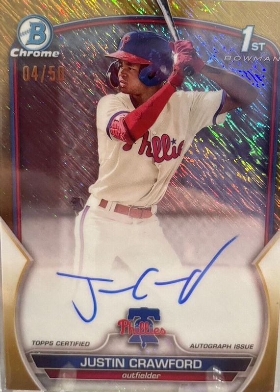 His Blue Refractor and Atomic Autos (/150 and /100, respectively), are going for around $200-$250. That’s not cheap, but not overpriced either. His .314 career average and high-.300s BABIP show the tremendous upside that Crawford has. We like him a lot, and seeing his athleticism in-person only helped the matter.