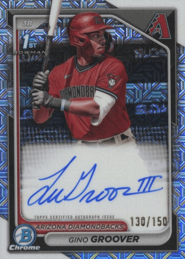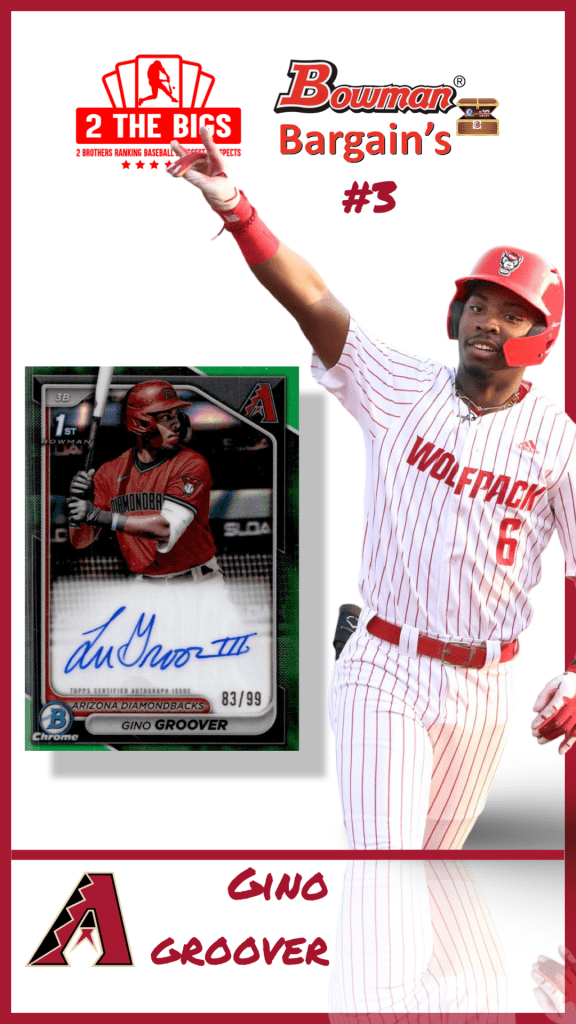 For the latest bowman bargain spotlight we continueto dive into the Diamondbacks recent draft picks. Today, we’ll cover 2023 2nd-round pick Gino Groover. Gino is a well traveled and prolific hitter that finished off his college career at NC State. His final collegiate season in 2023 is what helped propel him into the draft scene. He had a .332/.430/.546 slash line in 2023 with 13 home runs. But the the biggest statistical standout was his 9.4% K-rate.