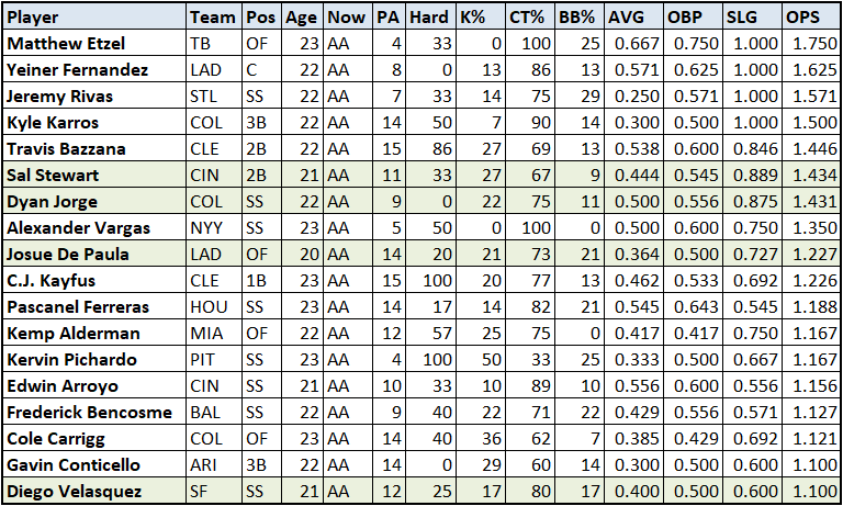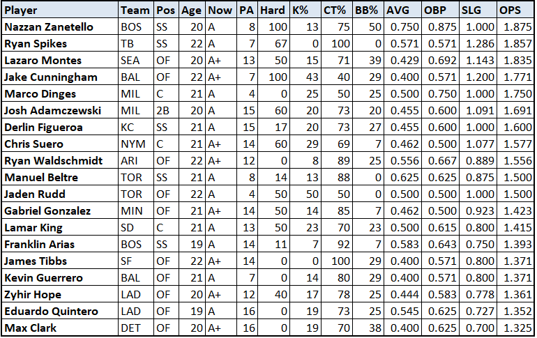 Let’s pump the breaks on A-ball since we’re only a few at-bats underway. I’ll be keeping an eye on the big names here over the next week or so (Clark, Hope, Tibbs, Montes, Zanatello).