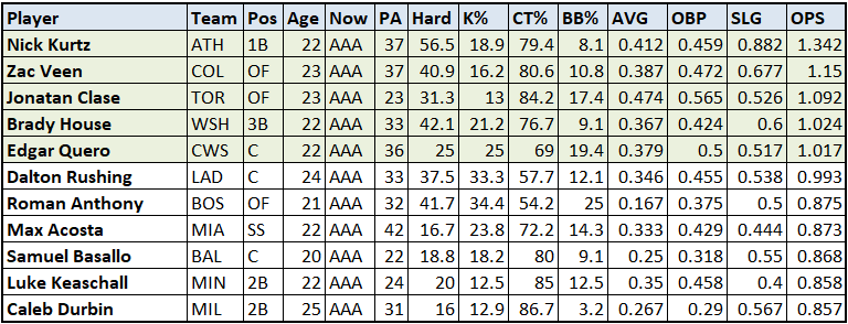 I have his upside score right at the line of an Everyday+ –> All-Star caliber player. His discipline and approach are top-tier in the minors right now, and if he can continue to drive the ball with more power. He’ll jump higher. His line-drive and fly-ball rates are up in the early days of the season, so signs are looking up.