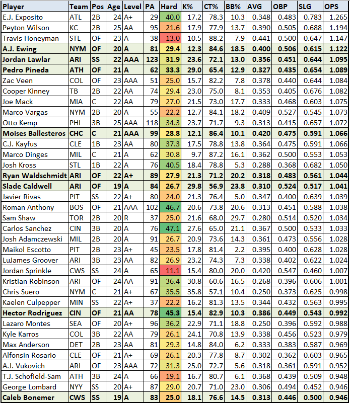 Did that opening week hot streak fade or become the new reality? We now have a true sample size for most of these kids (excluding DSL and Complex ball). With that, there are some prospects that should now officially be on your watch list.